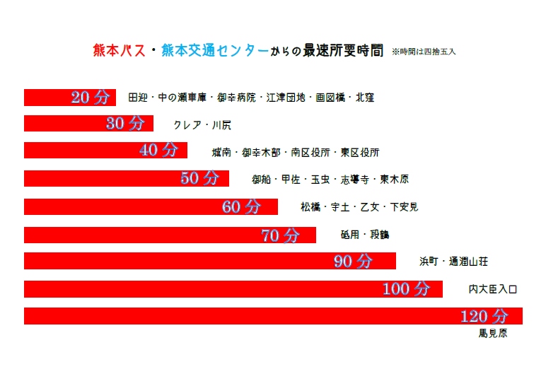 熊本バスの時刻表を基に、終点及び主な経由地について最速の所要時間を表しました。
