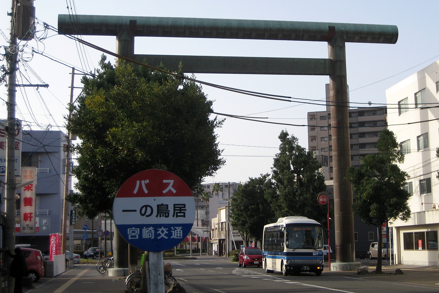 宮崎市内にあって、神武天皇を祀る宮崎神宮への参道の入り口である一の鳥居バス停。